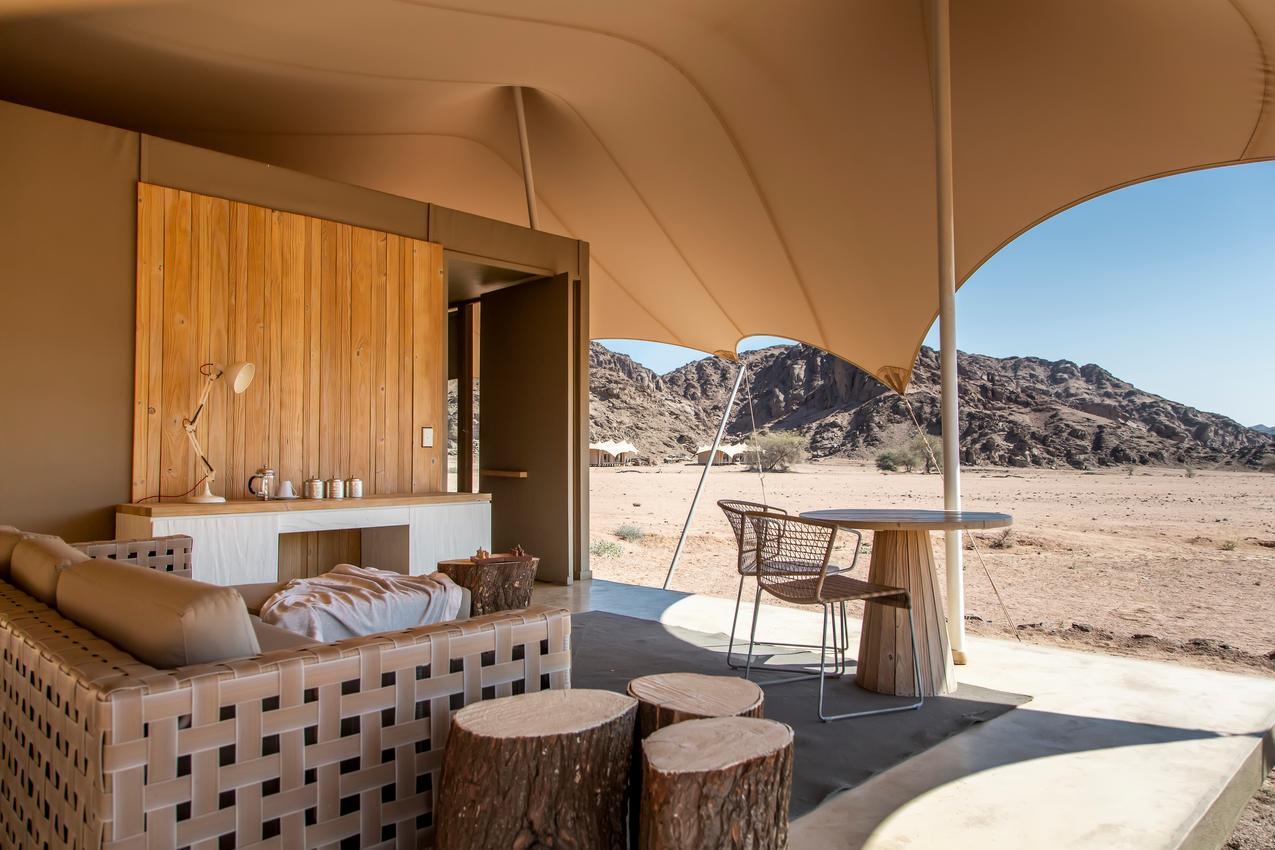 Set deep in the Namib’s dunes, with views across the Hoanib Valley to mountains, sand, and sky.