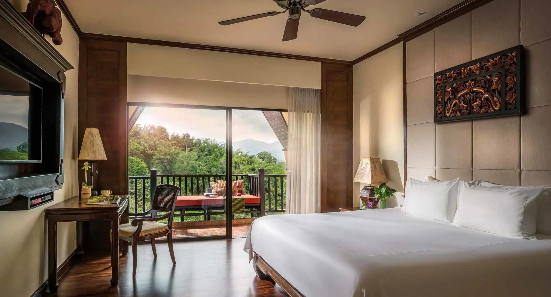 Spacious suite with teak furnishings, bathtub with mountain views, and balcony overlooking the Golden Triangle.